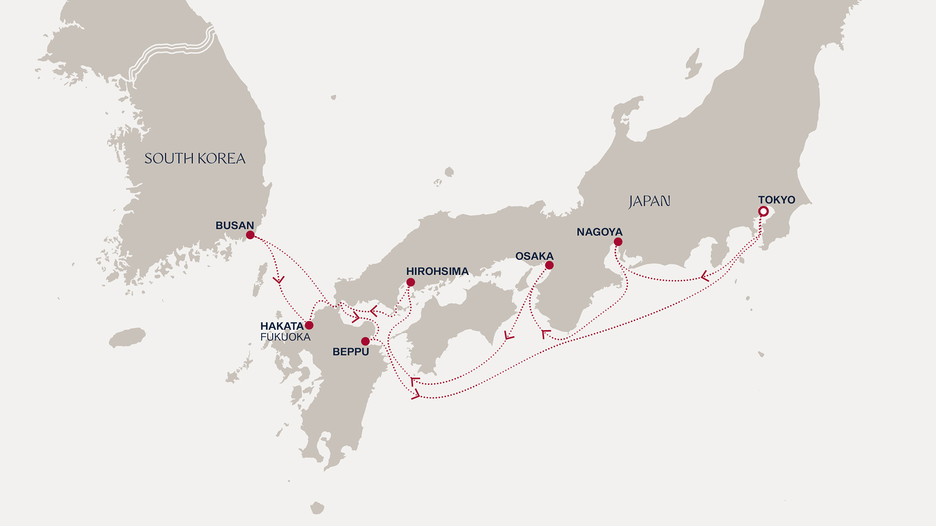 東京、名古屋、大阪、高知、広島、別府、釜山、長崎、下関、東京