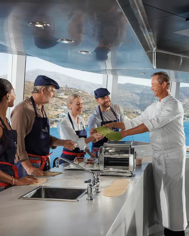 この体験は、船が訪れる地域を中心に継続的に進化し、陸上でも地元の市場や厳選された生産者を訪問します。隣接するプライベート ダイニング ルームは、ゲストが新しいスキルを披露し、ソムリエが厳選した極上のワインとともに、自分たちが作った素晴らしい料理を味わうのに最適な場所です。