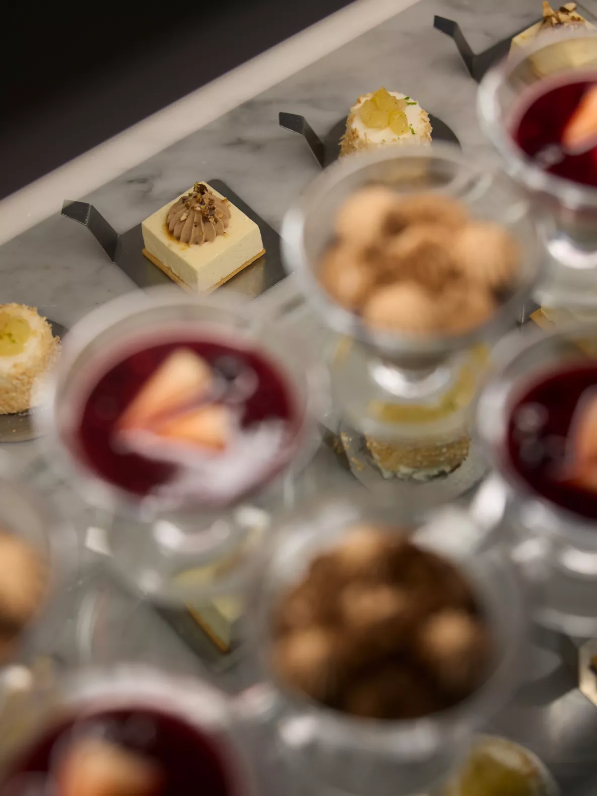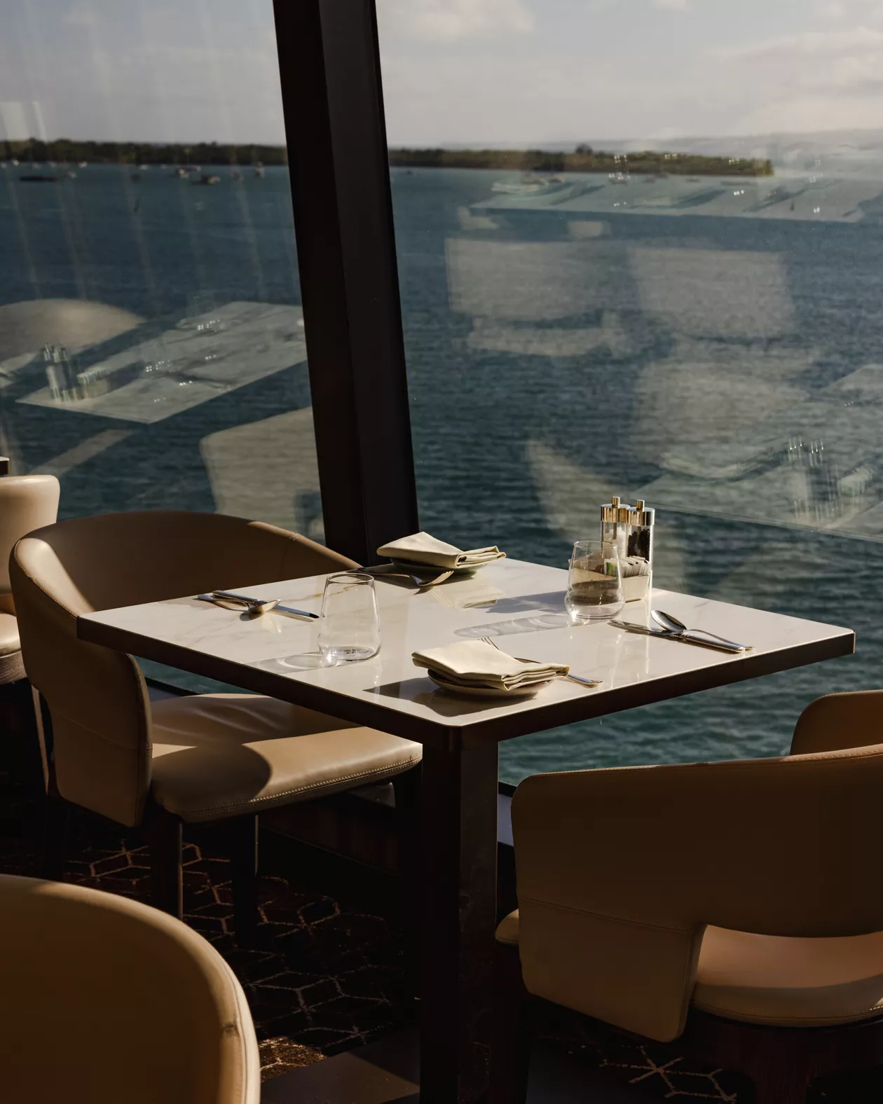 オープンキッチンは静かな活気に満ち溢れ、職人が丹精込めて作るシャルキュトリー、フロマージュリー、パティスリーのコーナーが洗練された雰囲気を醸し出します。水平線に沈む夕日を眺めながら、冷えたシャンパンと新鮮なクルード(生ハム)は絶妙な組み合わせです。