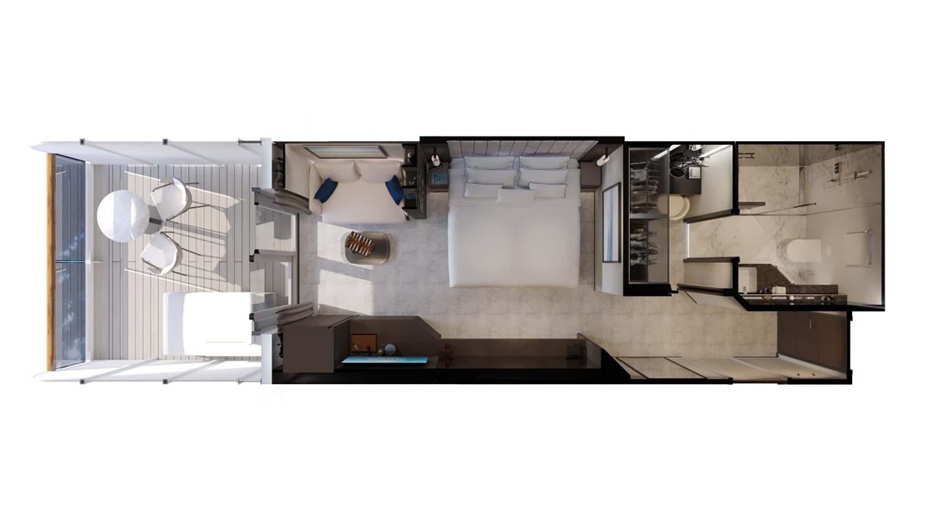 ラグジュアリーなおもてなしを生み出す、世界有数のスーパーヨットデザイナーや建築家と協働し、綿密に設計しました。そして、磨き抜かれたスイスの精緻さとモダンなヨーロッパの職人技、さらに活力あるデザインが融合する客室ができあがり、2022年クルーズシップインテリアアワードで「ベストキャビン」賞を受賞しました。