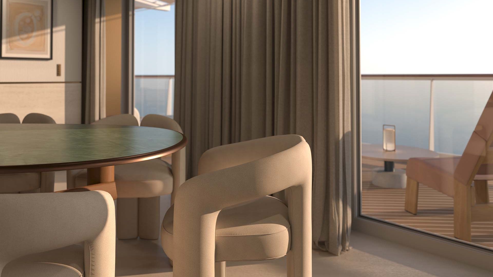 ・船の全幅に渡るオーシャンフロントのパノラマテラスには、広々とした屋外ジェットバス、デイベッド、ダイニングテーブル、ラウンジエリア、シャワー、サンラウンジャーが備わっています。