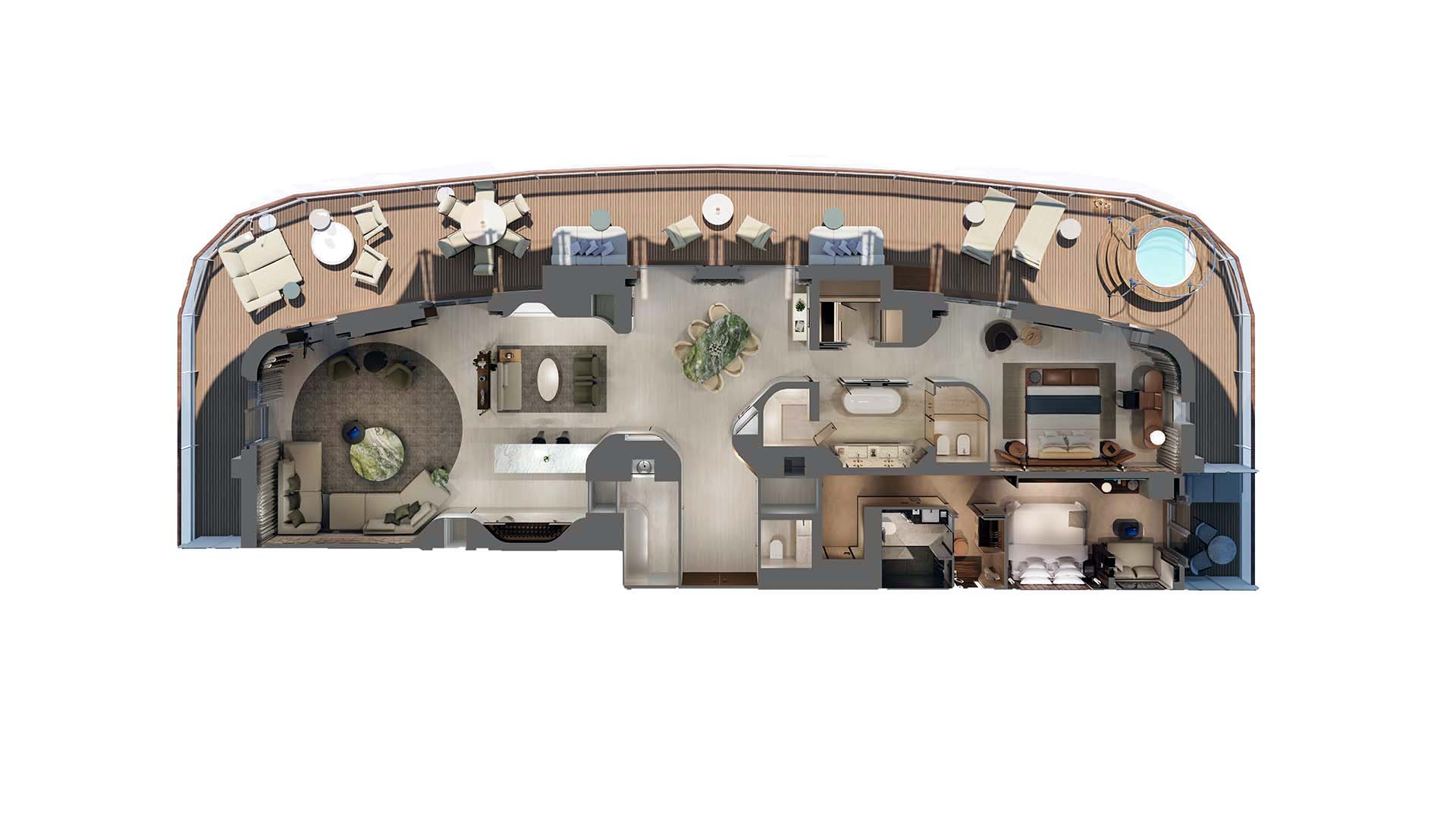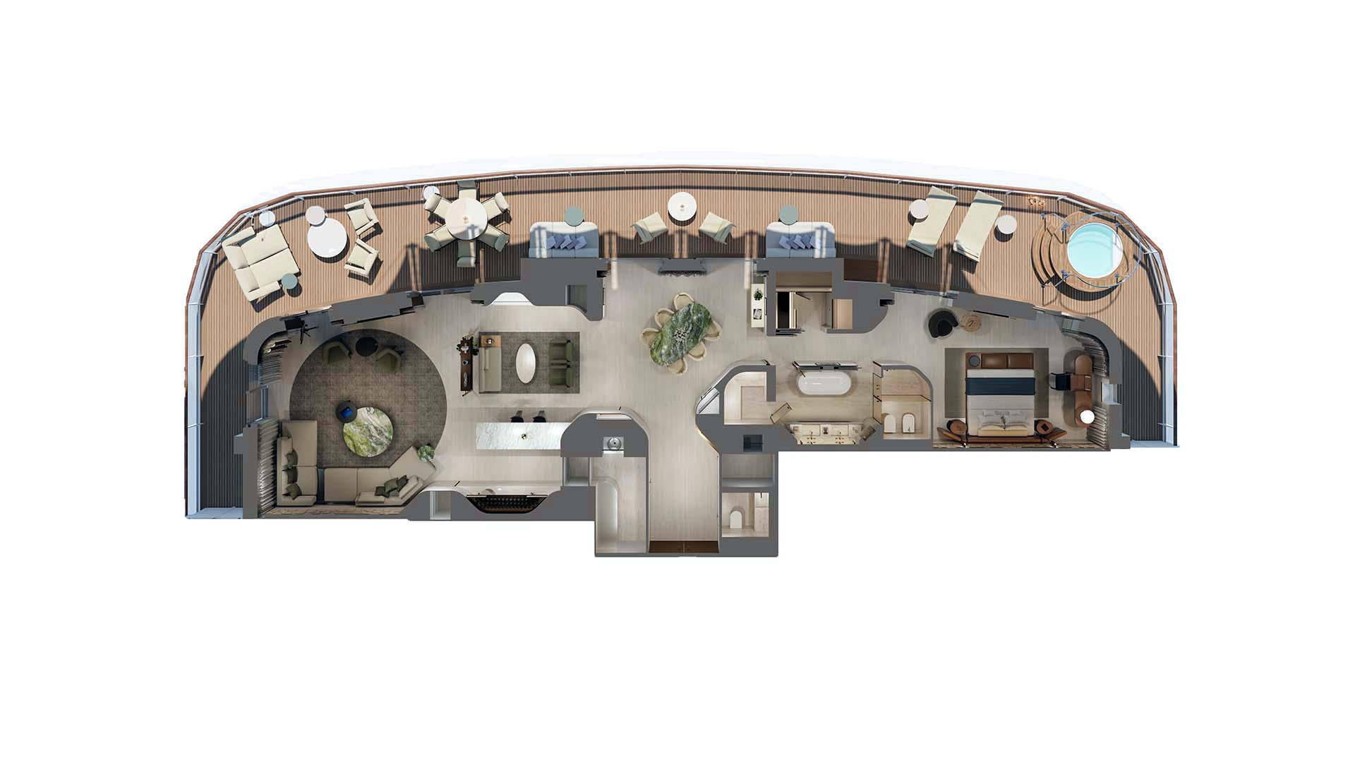 船上で最も高級なオーナーレジデンスは、パトリシア・ウルキオラが設計し、現代の海上生活の究極の表現、つまり感情と感覚に訴える没入型の旅を体現しています。